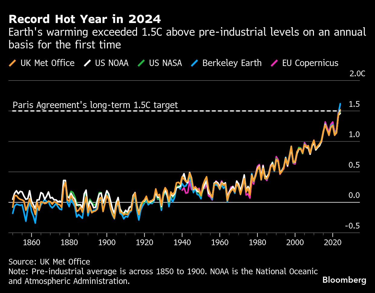 こうした状況は、地球が24年に観測史上最も暑い年を記録したことを反映している。しかも国連の世界気象機関(WMO)によると、この記録が向こう5年のうち少なくとも1年で破られる確率は80%に上る。