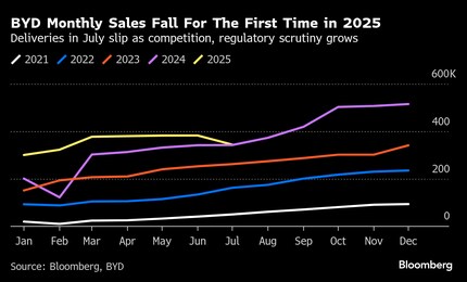 原題:BYD Shares Fall as Stalling Sales Put Annual Target in Question(抜粋)