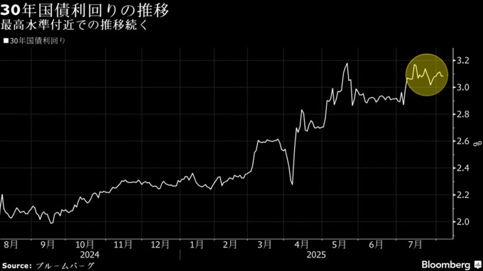 一方で、日銀は大規模な国債買い入れを段階的に縮小しており、30年債の利回りは過去最高に近い水準で推移している。7月の参院選で自民・公明の与党が大敗したことから、投資家の間で財政拡大への警戒感が高まっている。