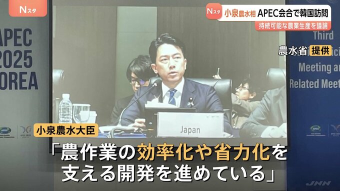小泉農林水産大臣は、韓国で開かれたAPEC=アジア太平洋経済協力会議の食料安全保障会合に出席し、持続可能な農業の生産に向けて参加国などに協力を呼びかけました。韓国・仁川で21の国や地域が参加した会合では、…