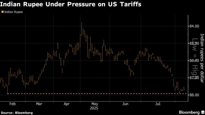ルピーは先週、1ドル=87.89ルピーまで下落し、過去最安値に迫った。米ホワイトハウスは6日、トランプ大統領がインドからの輸入品に対して25%の追加関税を課す大統領令に署名したと明らかにした。これにより、対インド関税は2倍の50%となる。