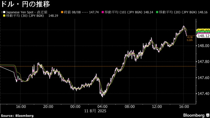 ブルームバーグ・ドル・スポット指数は上昇。円は対ドルで下落し、一時0.4%安の1ドル=148円25銭を付けた。