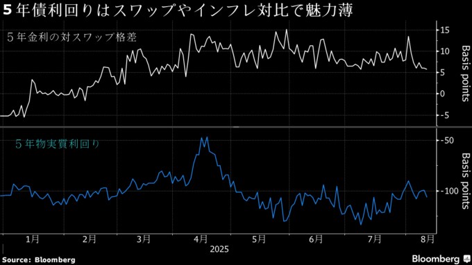 日本では利上げ期待が強まっており、5年スワップ金利は同期間の債券利回りと比べて上昇している。そのスプレッドは8月1日の直近最低の13bpから半分に縮小している。これはスワップを利用して潜在的な日銀政策引き締めに対して債券保有をヘッジしようとしている投資家にとってコストが高くなっていることを示唆している。
