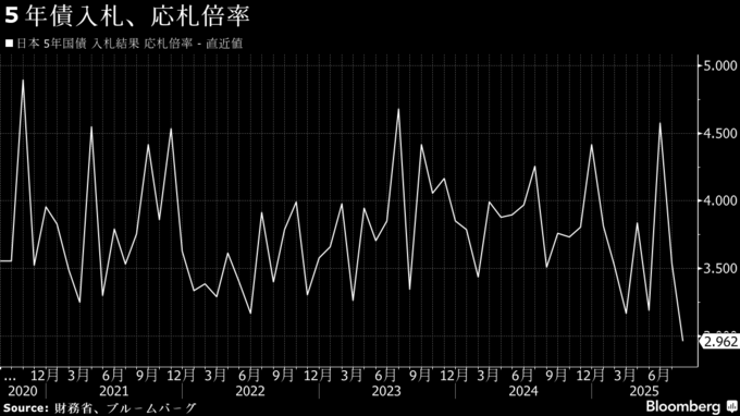 (ブルームバーグ):財務省が13日に実施した新発5年国債入札は、投資家需要の強弱を反映する応札倍率が2020年以来の低水準になった。日本銀行の利上げ継続や国内政治の先行き不透明感が意識される中、投資家が積極的な購入を控えた。