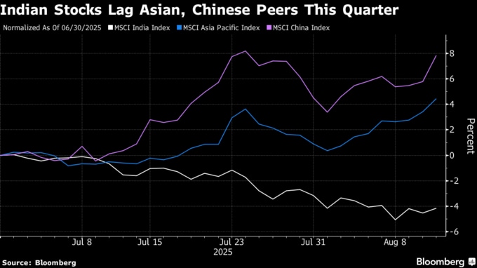 こうした中でも、インド株は先週、コロナ禍初期以降では最長となる6週連続の下げを記録。アジア主要市場の中で大きく出遅れている。7月には中国株がインド株を約8ポイント上回るパフォーマンスを示し、2月以降で最も差が広がっている。