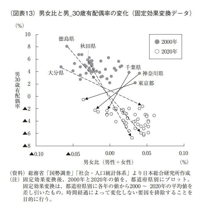 一方、東京圏を中心に、女性の流入などにより「人口の男女比」が小さくなった都県もある。そうした地域では、他の要因の影響もあるため、「男_30歳有配偶率」はプラスとはなっていないものの、低下幅は小さく抑えられている。