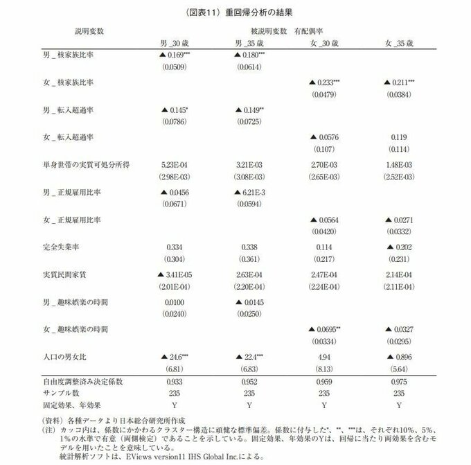 重回帰分析の結果をみると、性別、年齢を問わず有配偶率に高い相関を示したのは核家族比率のみで、次いで男性の有配偶率にのみ高い相関を示したのは、人口の男女比である。