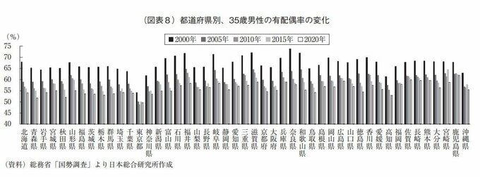 2000年時に35歳男性の有配偶率が最も高かった奈良県と東京都の差は、19.4%ポイントあったが、2020年に最も高い鹿児島県と東京都の差は12.3%ポイントまで縮まっており、東京都など一部地域を除く多くの地域で非婚・晩婚化が進んでいることが分かる。