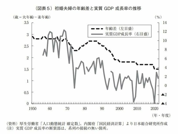 夫婦の平均年齢差には、実質経済成長率との連動性がみられ、成長率が低下している時期には男女が働いてともに家計を支える夫婦像が増えるなかで、年齢差が縮小したと考えられる。