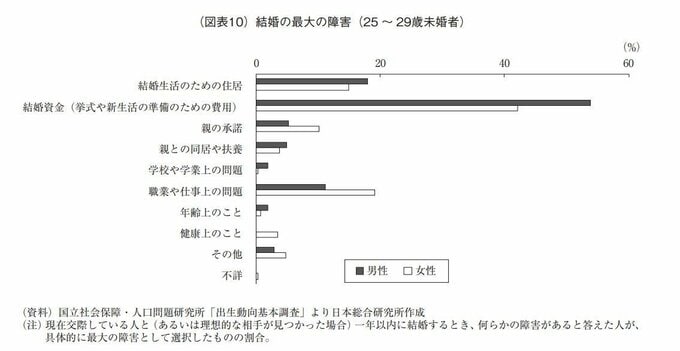 とくに、国立社会保障・人口問題研究所の出生動向基本調査によれば、若い世代が結婚しない理由として、結婚資金や住宅問題など、結婚に向けた経済的負担感の大きさを指摘する声が少なくない。