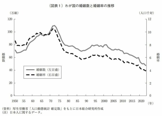 日本では、2000年以降長期にわたり婚姻数、婚姻率とも低下傾向にある。