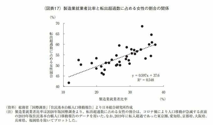 そのため、就業者全体に占める製造業就業者の割合が高い地域では、転出超過数全体に占める女性の割合が高い傾向にある。