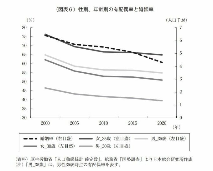 2010年から2020年までの低下率は、少子・高齢化の影響を受ける婚姻率が21.8%であるのに対し、有配偶率では男女各年齢とも、2.3〜5.7%にとどまる。
