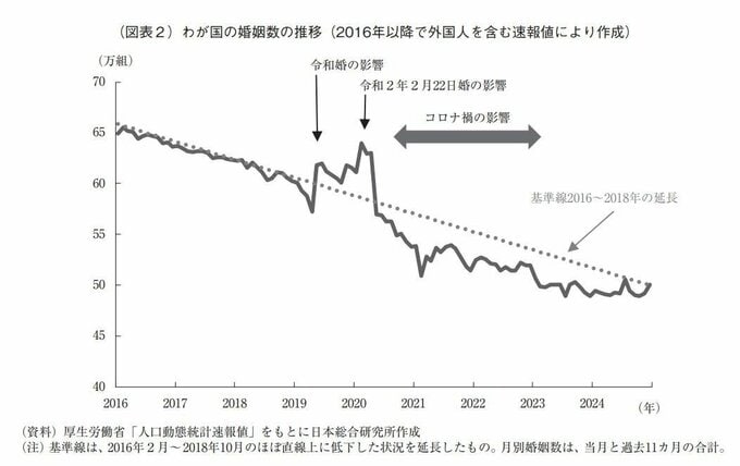 そうした状況下、2020年以降は、コロナ禍によって婚姻数・婚姻率とも一層大きく下振れし、出生数下押しの一因となった。
