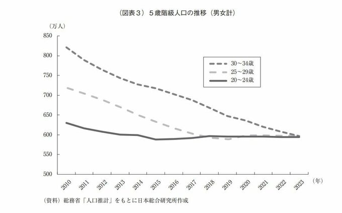 20〜24歳では2015年以降、25〜29歳では2018年以降横ばいとなっており、依然として減少傾向がみられる30〜34歳の年齢層も、ほどなくして横ばいとなろう。