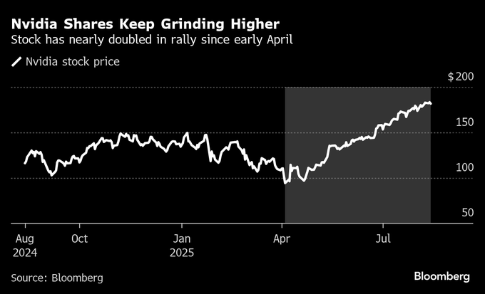 (ブルームバーグ):トランプ米大統領は今週、エヌビディアが中国で販売した一部半導体について、売上高の15%を米政府が徴収すると明らかにした。市場で注目を集めたが、結果的に同社株への投資意欲が衰えることはなかった。