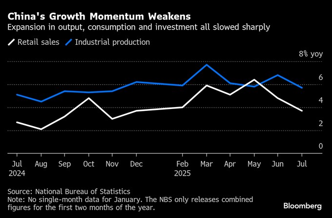 国家統計局が15日発表した7月の小売売上高は前年同月比3.7%増加。ブルームバーグ調査の予想中央値は4.6%増だった。6月は4.8%増加していた。7月の工業生産は前年同月比5.7%増と、昨年11月以来の小さな伸び。予想は6%増加だった。6月は6.8%増えていた。