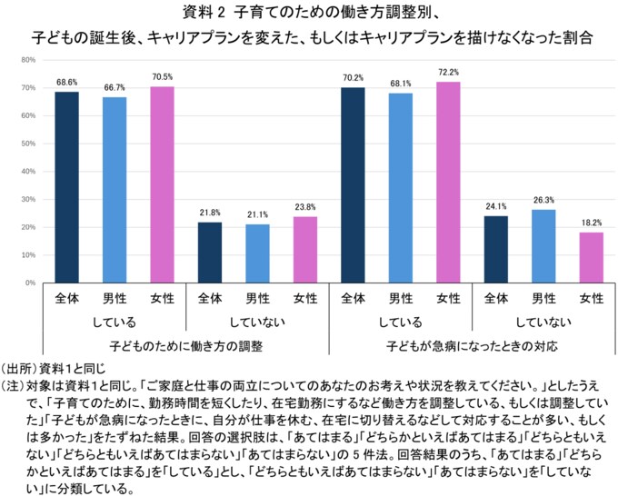 「子育てのために勤務時間を短縮したり、在宅勤務に切り替えるなど働き方を調整している(または調整していた)」人のうち、68.1%がキャリアプランを変更したと回答している。