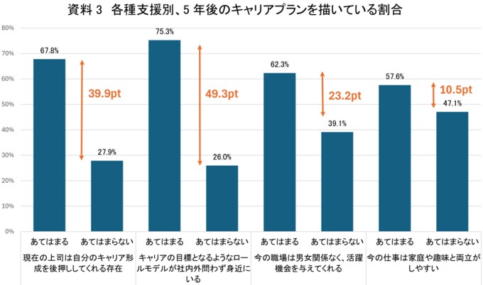 同様に、「キャリア目標となるようなロールモデルが社内外問わず身近にいる」人では、75.3%にまで上る。これらの支援は、その有無による差が大きく、キャリアプランを描くことに強く影響していると考えられる。
