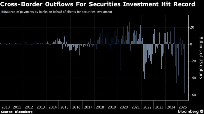 こうした資本流出の急増は、中国本土の投資家による香港株式の積極的な買いに加え、いわゆる南向きの「南向通」の投資枠拡大によって海外債券への投資が拡大したことが一因とされる。一方で、よりリスクの高い資産や世界的な代替資産と比較して相対的な魅力が薄れたことなどを理由に外国人投資家は中国国債の保有を引き続き減らしている。