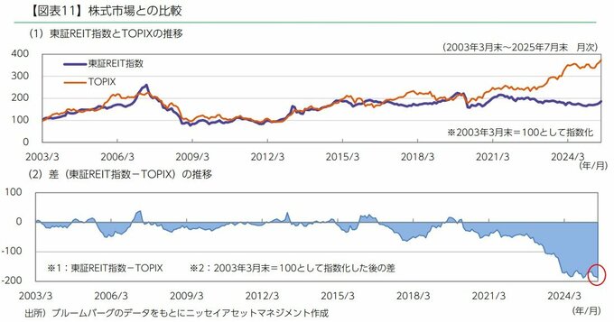 • 7月末の東証REIT指数のTOPIXに対する下方乖離幅は、東証REIT指数の算出が開始された2003年3月末以降で見ると、最高水準となっています。足元のJ-REITはTOPIXに対し、出遅れ感の強い状態にあると考えられます。