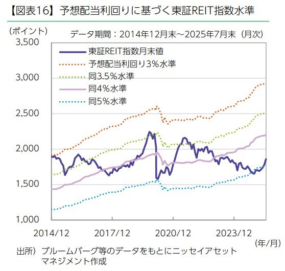 ・ 7月末の東証REIT指数は1,859.19ポイントと、予想配当利回り4.0%水準である2,203ポイントを下回りました。31ヵ月連続で4.0%水準を下回って推移しています。