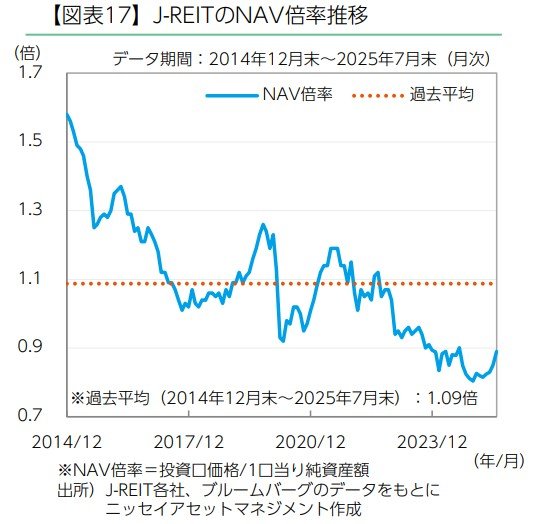 • 7月末のNAV倍率は0.89倍で、前月末時点から上昇しました。過去平均(2014年12月末〜2025年7月末)の1.09倍を35ヵ月連続で下回りました。