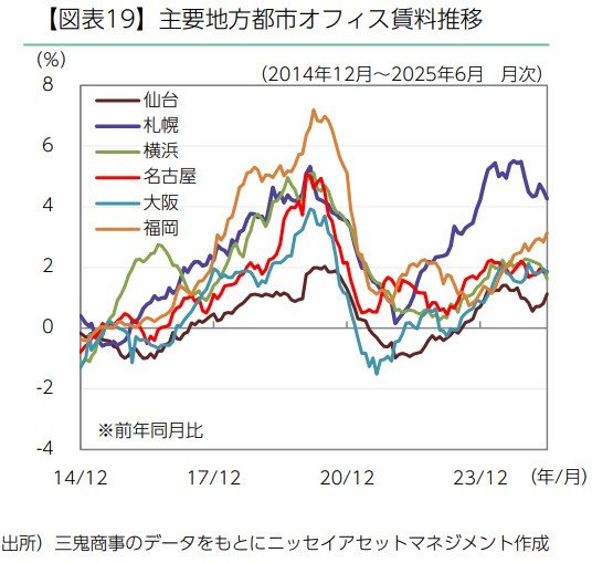 ・6月の主要地方都市別オフィス賃料は、多くの主要地方都市で前年同月を上回りました。福岡は前年同月比+3.14%と前月の同+2.84%から伸び幅が拡大しています。