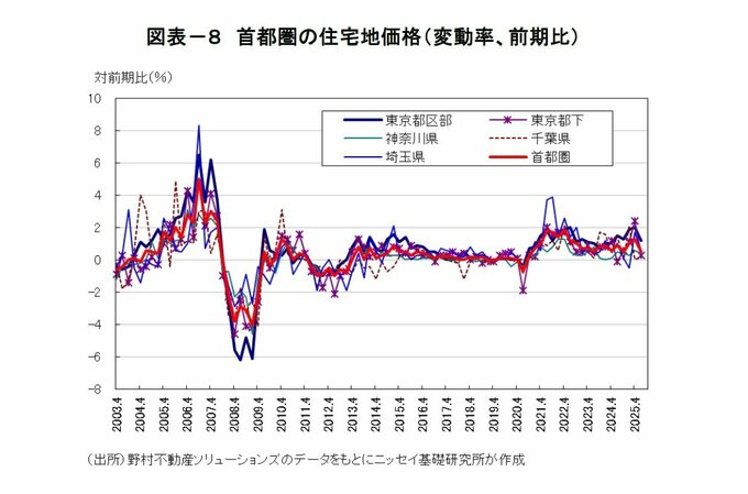 また、野村不動産ソリューションズによると、首都圏住宅地価格の変動率(7/1時点)は前期比+0.5%(前回+1.3%)となり20四半期連続でプラスとなった。