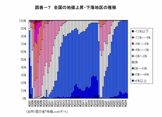地価は、住宅地・商業地ともに上昇している。国土交通省の「地価LOOKレポート(2025年第1四半期)」によると、5四半期連続で全ての地区(全国80地区)が上昇となった。