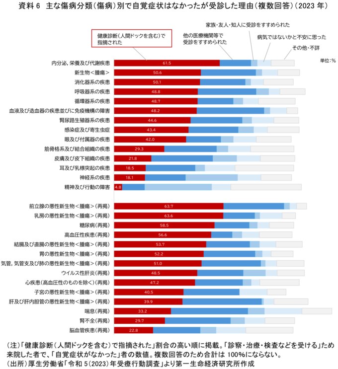 ここでは、厚生労働省が公表する別データになるが、「令和5(2023)年受療行動調査」に基づき、主な傷病分類(傷病)別に、自覚症状がなかった人が受診した理由について確認しておく。