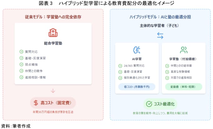 だからこそ、AIと学習塾の役割を最適に分担する「ハイブリッド型学習」が現実的な選択肢となる。また、こうした新たな選択肢の出現により、家計状況により生じる教育格差の是正も期待される。