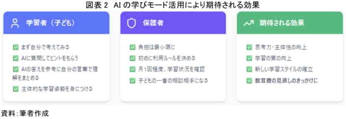 なお、AI活用は既存の学習方法を完全に代替するというよりは、新しい選択肢となりうるものといえる。家庭に「AIの学びモード」を取り入れることは、新たな学習スタイルを追加することになる。
