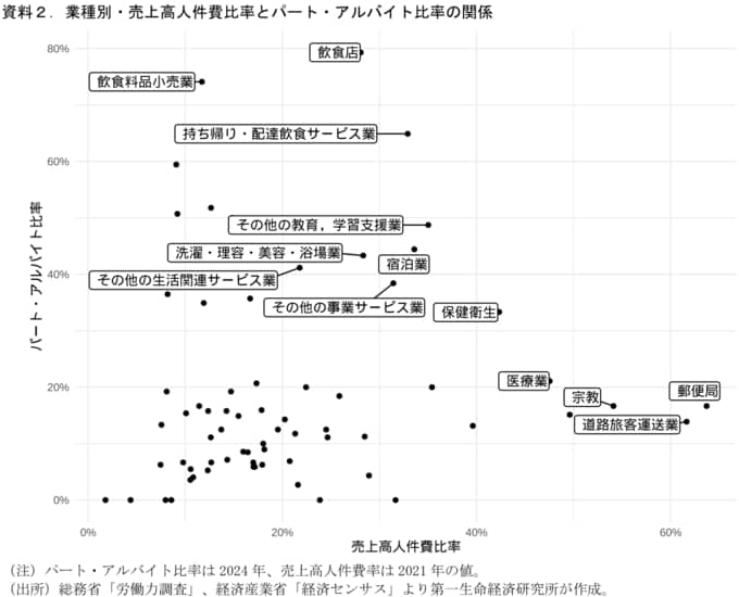 最低賃金の引き上げが相対的に販売価格の上昇につながりやすい業態であることが確認できる。