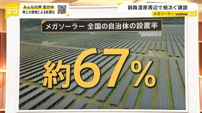 釧路湿原は、日照時間が長く、しかも平地で、近くに送電線もあります。そのため、太陽光発電の開発には適している場所だということですが、資源エネルギー庁によりますと、メガソーラーを設置している自治体自体は67%ほどですので、全国の市区町村の3分の2で既に設置されており、釧路市だけの問題ではないということですよね。