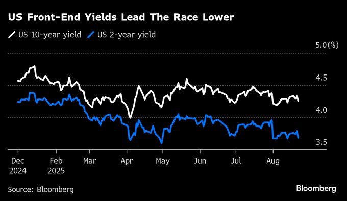 パウエル議長はワイオミング州ジャクソンホールでのカンザスシティー連銀主催の年次シンポジウム(ジャクソンホール会合)で講演し、労働市場のリスクの高まりに言及。「リスクのバランスが変化しており、政策スタンスの調整を正当化する可能性がある」と述べた。利下げのシグナルを強く発した格好となり、国債相場は上昇(利回りは低下)。長短金利差は過去4年で最大に拡大した。これはFRBがハト派姿勢を強める局面で典型的にみられる市場の反応だ。