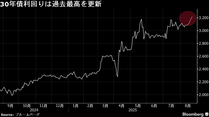 財政拡張リスクが意識される中、19日の20年利付国債入札が弱めの結果となったことをきっかけに超長期金利の上昇が加速、新発20年債利回りは22日、1999年以来26年ぶりの高水準を更新した。パウエル米連邦準備制度理事会(FRB)議長が22日の講演で利下げを示唆したと受け取られ、米国の長期金利は大幅に低下したが、週明けの日本の超長期金利は小幅な低下にとどまっている。