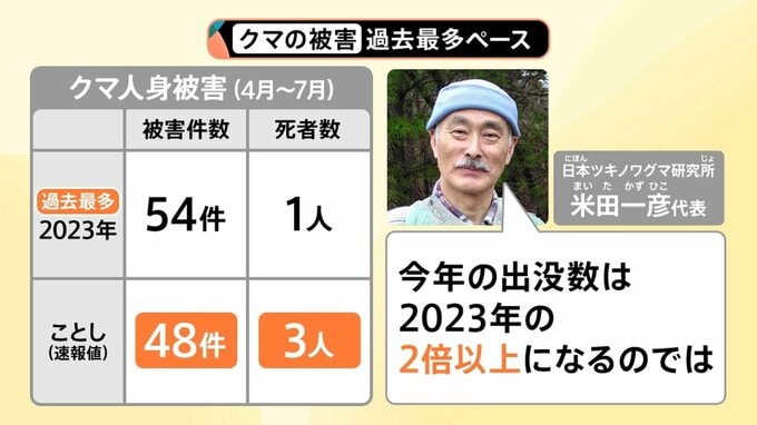日本ツキノワグマ研究所の米田一彦代表いわく、クマの被害がより出始めるのは秋で、ここからシーズンを迎えるため、「2025年の出没数は2023年の2倍以上になるのでは」とのことです。