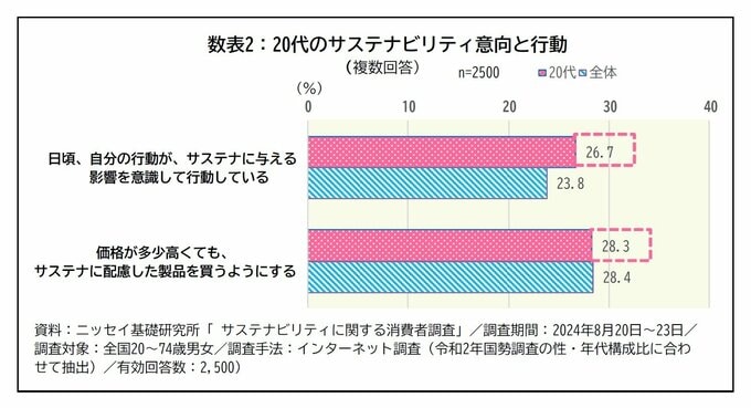 また、「自分の行動がサステナビリティに与える影響を意識している」は26.7%と全体より高く、「価格が多少高くても配慮した製品を選ぶ」は28.3%で全体とほぼ同等であった。