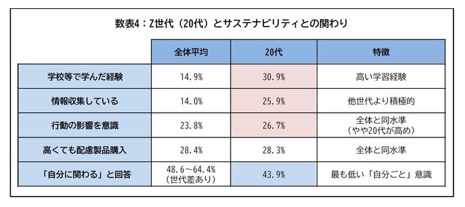 総合調査機関の日本リサーチセンターが2025年に実施した社会調査によれば、「サステナは自分に関わりがある」と答えた割合は、20代が43.9%と全世代で最低水準となった。