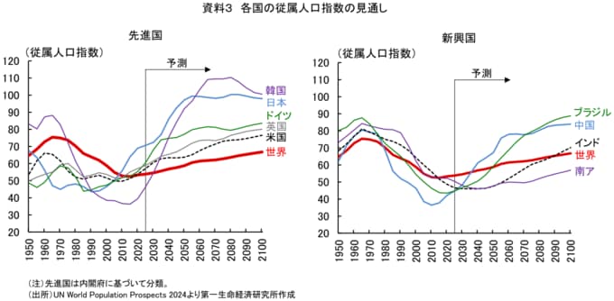 一方の新興国は、推移にばらつきがある。現時点では中国やブラジルも世界全体を下回って推移しているものの、中国は2040年、ブラジルは2050年には世界全体を上回る見通しとなっている。