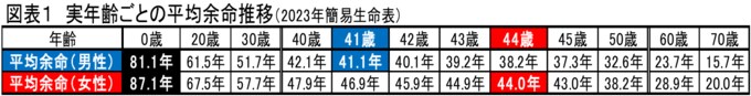 厚生労働省「令和5年簡易生命表」に基づいて男女別に実年齢ごとの平均余命を調べると、実年齢と平均余命がほぼ同じになるのが男女ともに 40 代前半である。