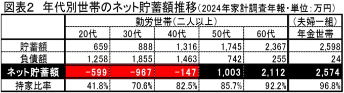 総務省「令和6年家計調査年報(家計収支編)」から、二人以上世帯の年代ごとのネット貯蓄額(貯蓄額-負債額)を算出したものを見ると、家計収支は 20代からずっと赤字(貯蓄負債)に転換する。