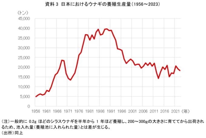 「漁業・養殖業生産統計年報」及び財務省「貿易統計」を使用した水産庁の「ウナギ供給量の推移」によれば2024年は52トンだ。