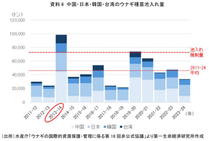 4か国の池入れ量上限は78.8トンに固定されているが、実際の池入れ量は2012~24年漁期の平均で約45.5トンと、上限の58%ほどにとどまっている。