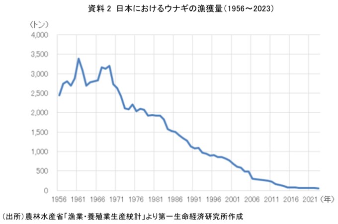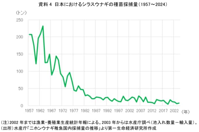国内でのシラスウナギの種苗採捕量は過去と比べて著しく減少した。1960年代には200トン超あったものが、2024年には7.1トンと、その減少幅は実に95%以上となっている。
