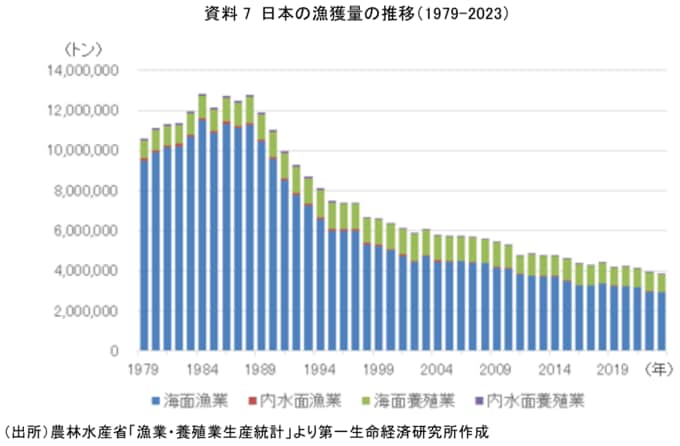 ここで、日本の水産業全体の状況を確認してみたい。日本の漁獲量は1984年の1,282万トンをピークに、現在では3分の1程度にまで減少している。