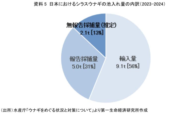 しかし、水産庁「ウナギをめぐる状況と対策について」によれば、輸入量と報告採捕量を足しても、池入れ量との差は2.1トンあり、出どころはわかっていない。