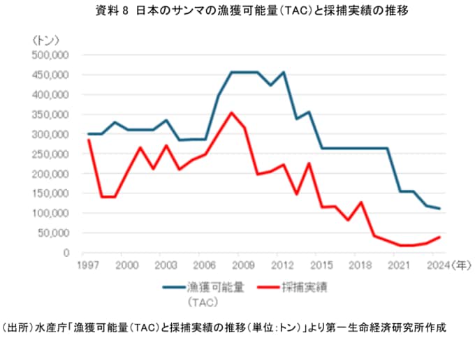 サンマは世界では12万トンほど水揚げされているが、北太平洋漁業委員会(NPFC)は持続可能な水揚げ量を世界全体でおよそ7.6万トンとしている。
