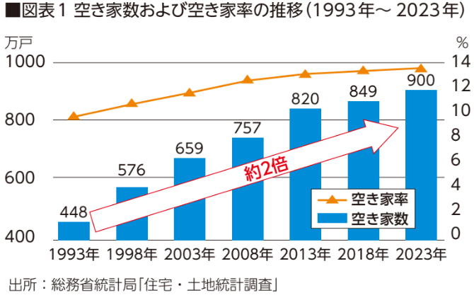総務省「令和5年(2023年)住宅・土地統計調査」によると、2023年の空き家数は900万戸であり、前回調査の5年前と比べ51万戸の増加で過去最多、30年間でみると空き家数は約2倍に増加し、空き家率も13.8%と過去最高となりました。